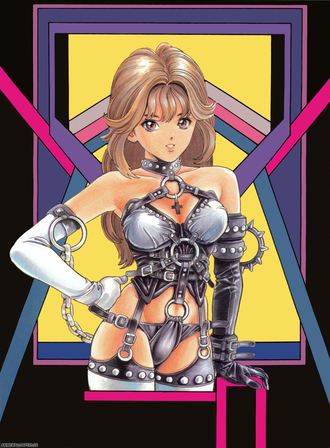 Eine so knappe Bekleidung ist es gar nicht. Die Art der Kleidung täuscht dies vor. Das Bild wirkt sehr erotisch, vorallem durch die großzügige Verwendung von Leder, Lack und eisernen Objekten gepaart mit der Gefährlichkeit und Gefangenschaft, die dieses...